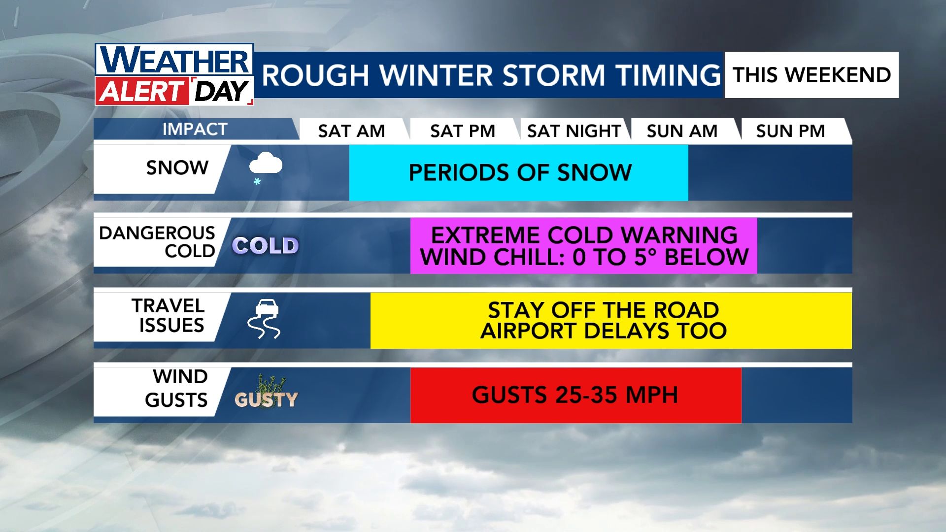 The winter storm warning, which began on Friday, continues through Sunday at 7 a.m. and impacts the entire state. Saturday and Sunday are WRAL Weather Alert Days due to our increasing snow chances.