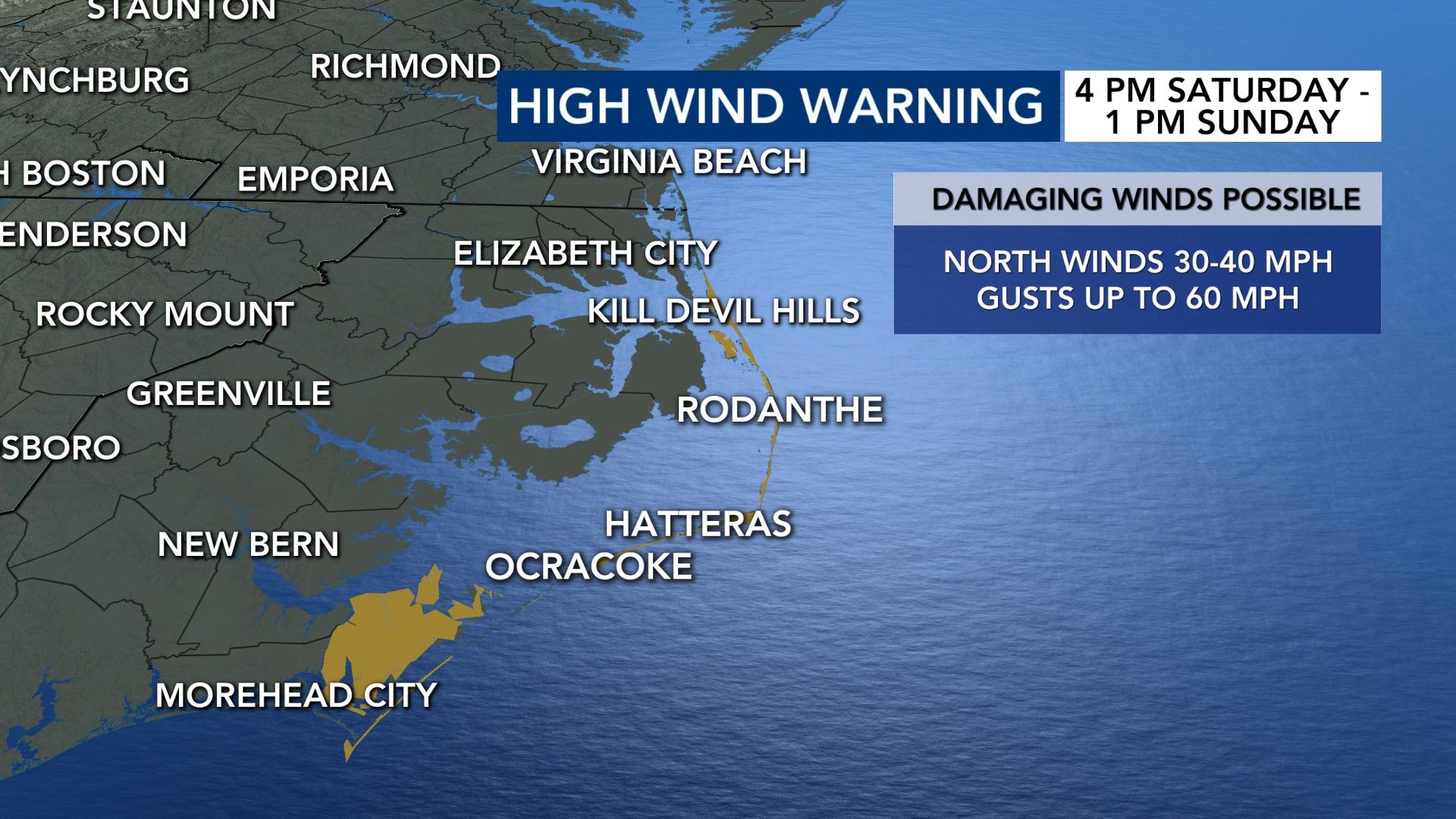 With high wind gusts expected, Stein warned of the possibility of coastal flooding. WRAL meteorologist Grant Skinner says the Outer Banks is expected to see two to four feet of inundation, five to 12-foot waves in the surf zone and gusts up to 60 miles per hour.