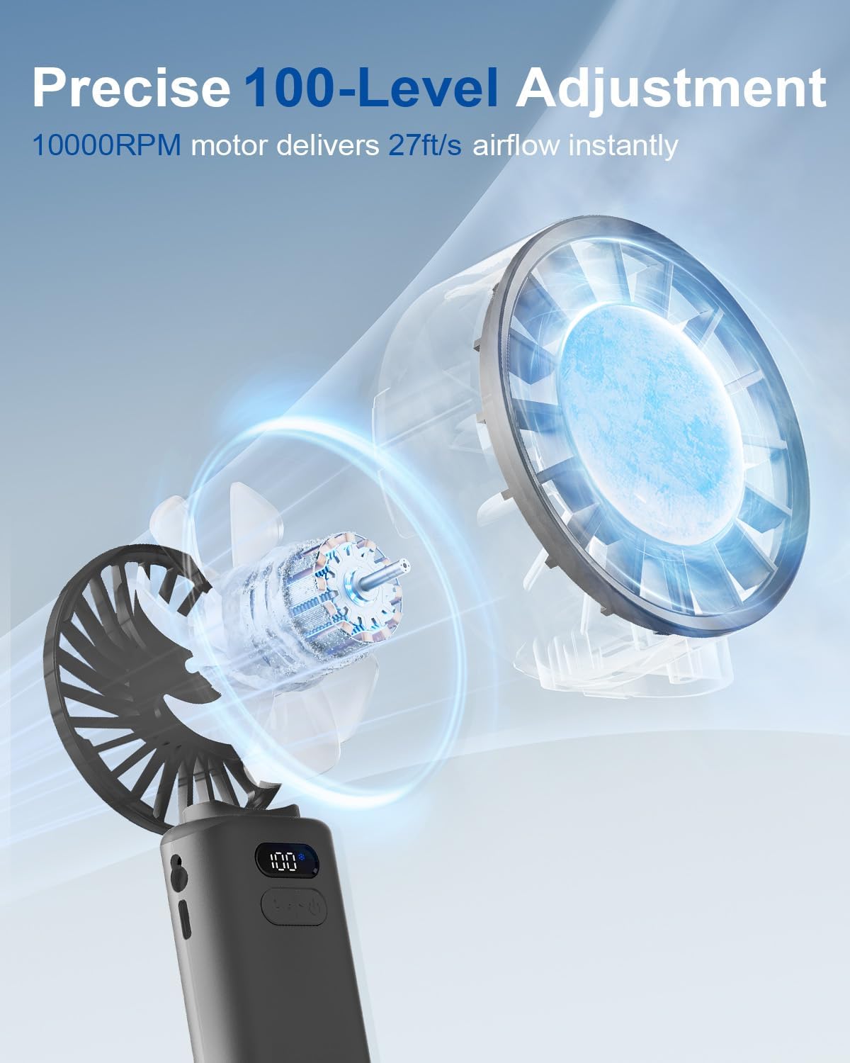 100 Adjustable Speeds for Personalized Comfort – Unlike typical fans handheld models, this portable handheld fan features 100 precise wind levels, offering a customized experience for any situation.