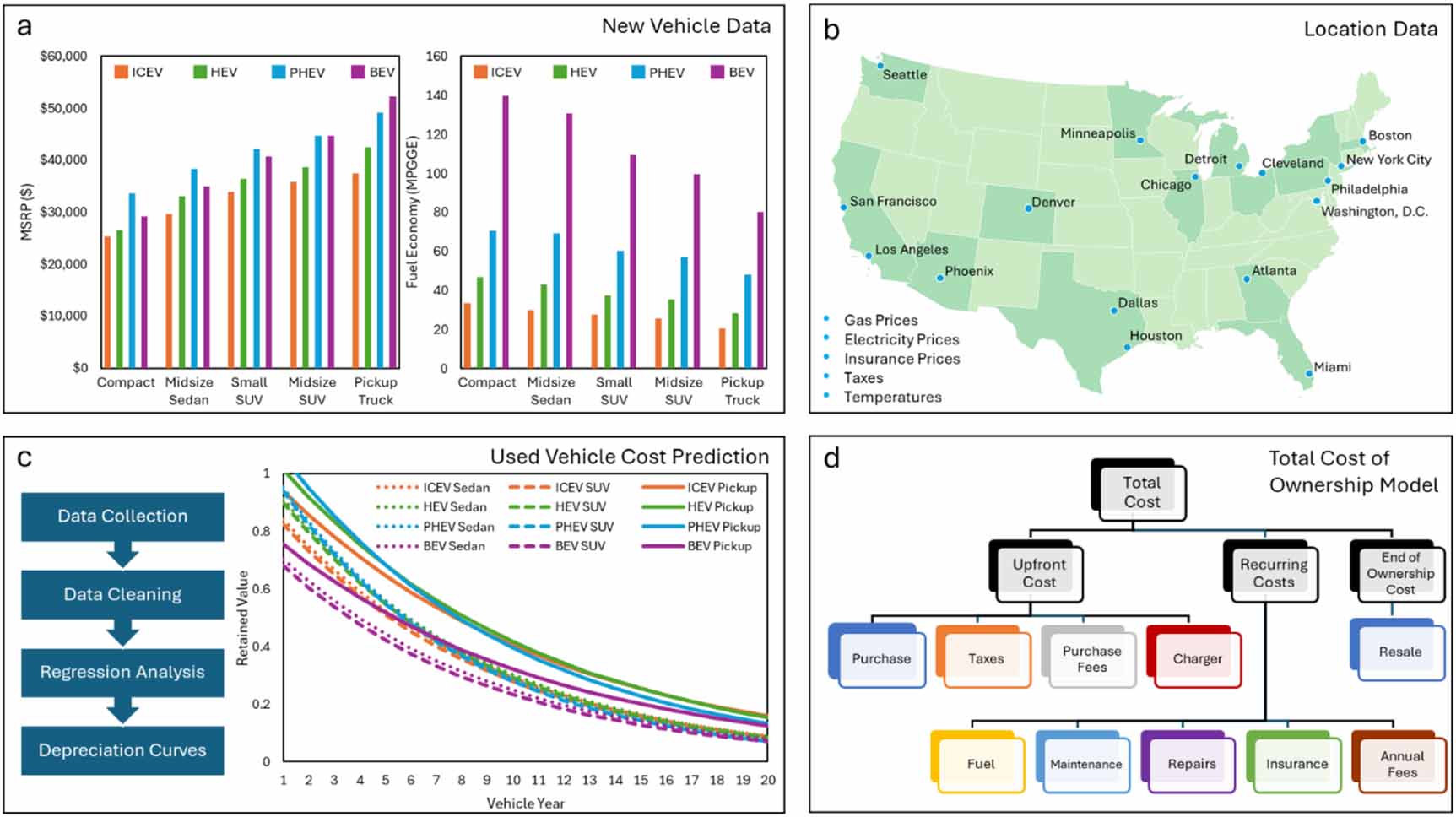 (a) The manufacturer’s suggested retail price (MSRP) and fuel economy for the combinations of vehicle class and vehicle powertrain used in this study. (b) The 17 U.S. cities investigated in this study, and the location specific data that was used in modeling. (c) Vehicle depreciation curves resulting from regression analysis of used vehicle listings collected from craigslist.org. (d) The components of total cost of ownership.