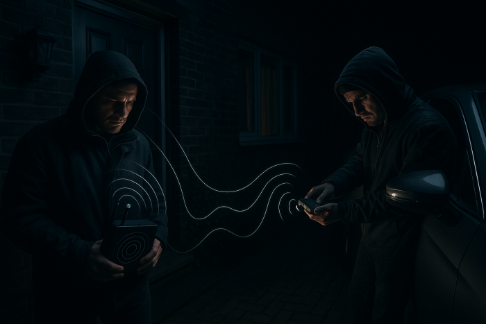 Key cloning devices: Thieves can clone your key’s data in seconds if they get close enough, like at petrol stations, supermarkets, or outside your home.